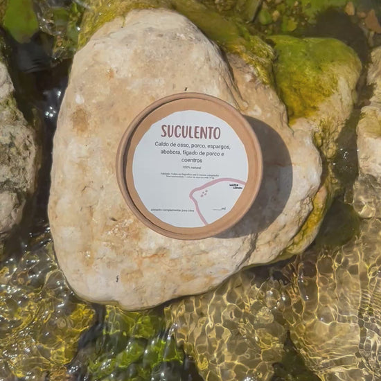 Bonemousse Suculento é um patê cremoso, natural e nutritivo, feito com lombo e fígado de porco de qualidade alimentar, caldo de osso, espargos, abóbora e coentros.